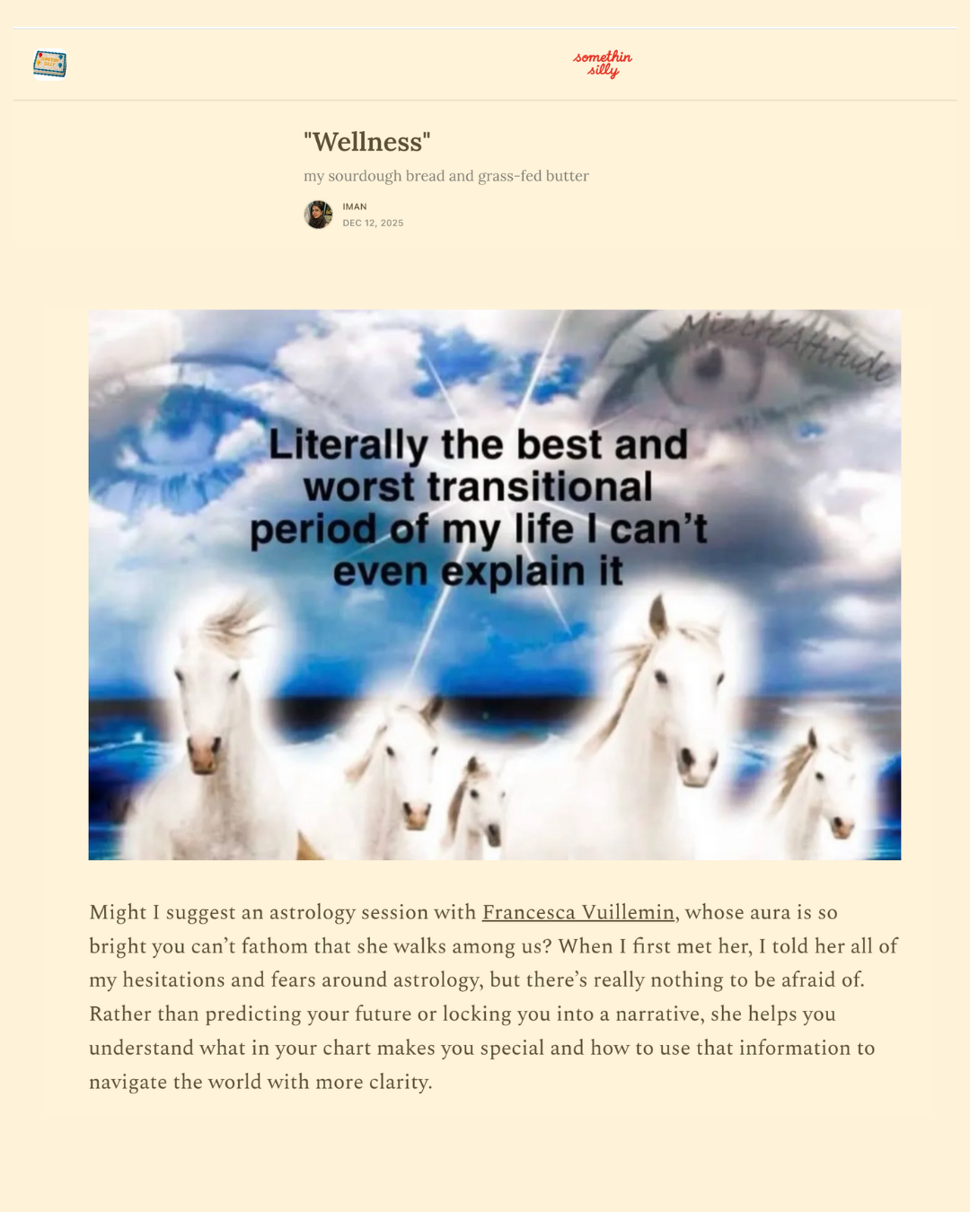 "Wellness" my sourdough bread and grass-fed butter by Iman Balagam Read Full Article Follow Iman & Read Her Stellar Work On Instagram Francesca VuilleminDecember 16, 2025Iman BalagamIman Balagam, somethin silly substack, wellness, December 2025, WTHN acupuncture, The Class, You Acu, SYI Acu, EFT, Emotional Freedonm Technique, 528 HZ, Headdpace, Francesca Vuillemin, Francesca Vuillemin astrologer, Substack Facebook0 Twitter 0 Likes